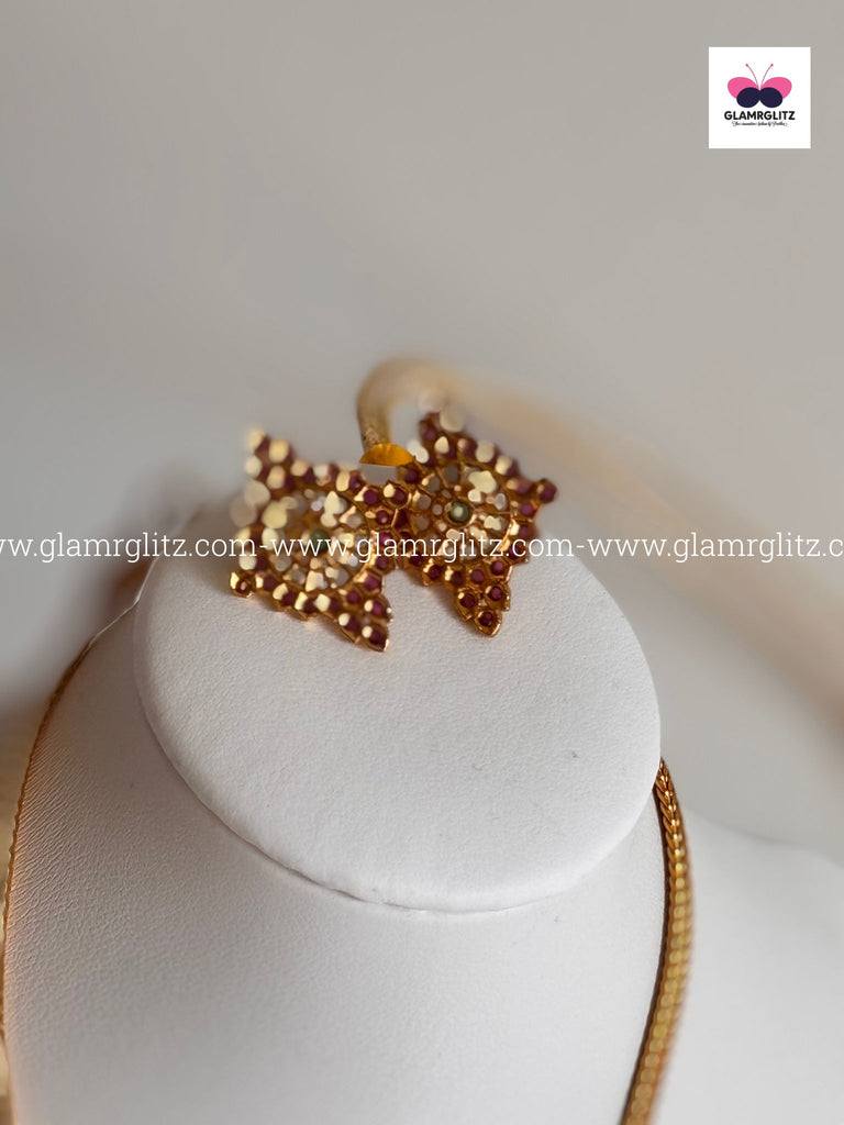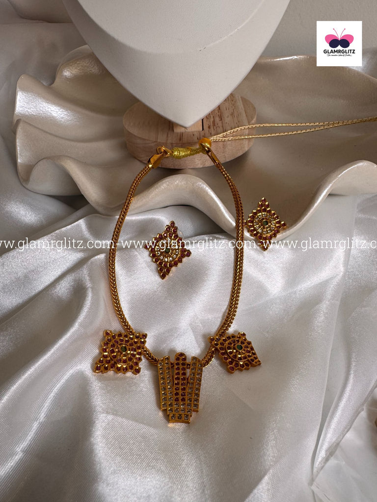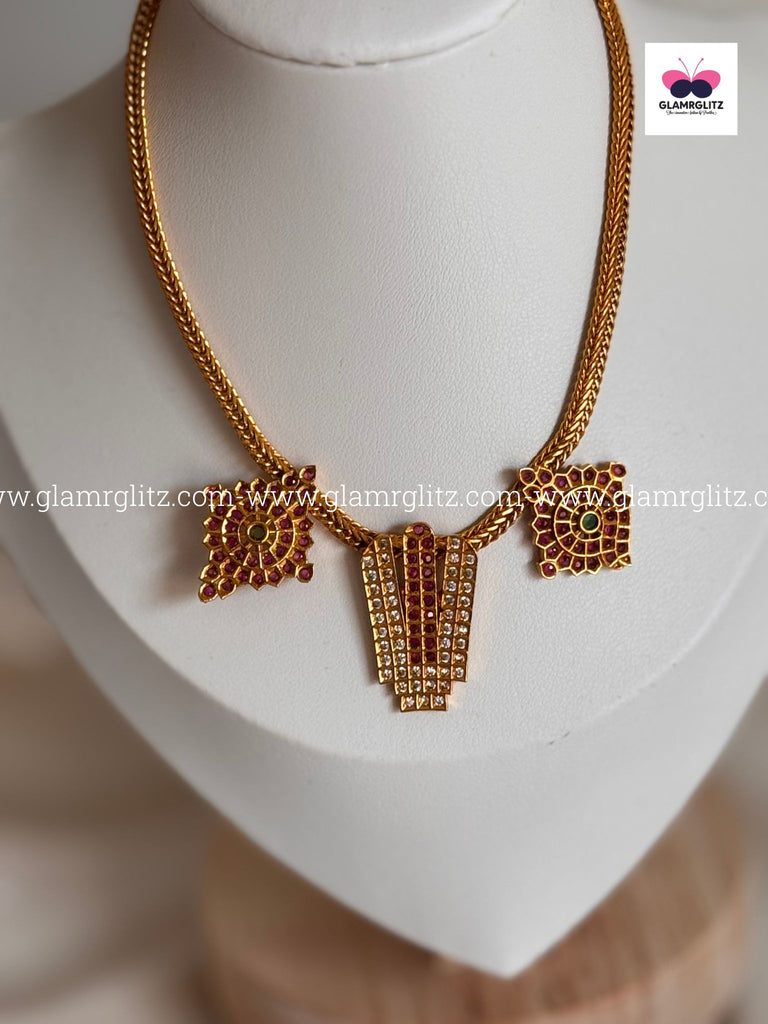 Elevate your ethnic look with this stunning traditional jewellery set, beautifully crafted with intricate detailing and vibrant stones. The set features a bold gold-tone chain paired with three eye-catching pendant elements in classic temple-inspired patterns. Each pendant is embellished with red and green stones, adding a rich and festive touch.